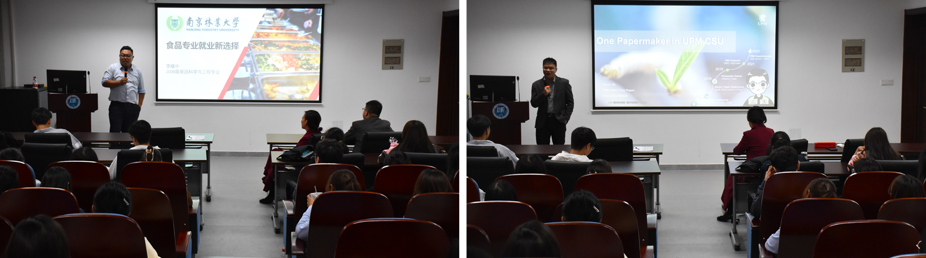 会上,李耀中学长从自身创业和工作经历出发,以现代餐饮和食品安全监督为主题,将“专业”与“行业”互联,向同学们全面展现出未来职业规划蓝图。同时,李学长鼓励同学们做好职业规划,在校期间全面培养自身基本素养和职业技能,为进入职场做好充分准备。齐亚楠学长以学业与职业道路为引,与在座同学们分享了毕业后自身的经历与心境,同时也介绍了造纸行业的行业现状与前沿科技,激发同学们对专业的热爱以及扎根行业的决心。